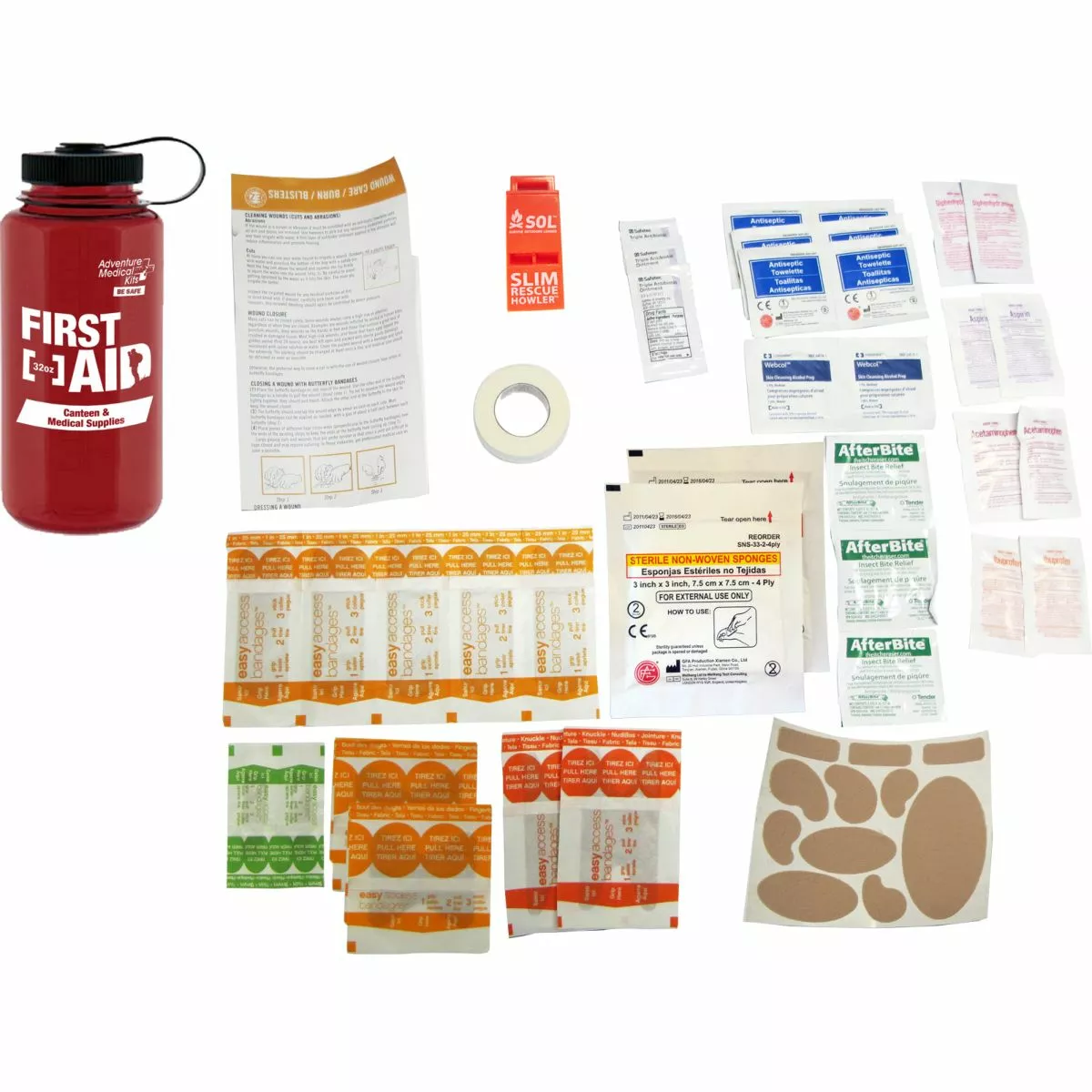 The Adventure First Aid 32 oz Kit contains supplies to treat cuts & scrapes, sprains, insect bites, headaches, muscle aches, and allergic reactions. All supplies are contained in a sturdy, BPA-free plastic water bottle and will keep contents dry or water in depending on need.