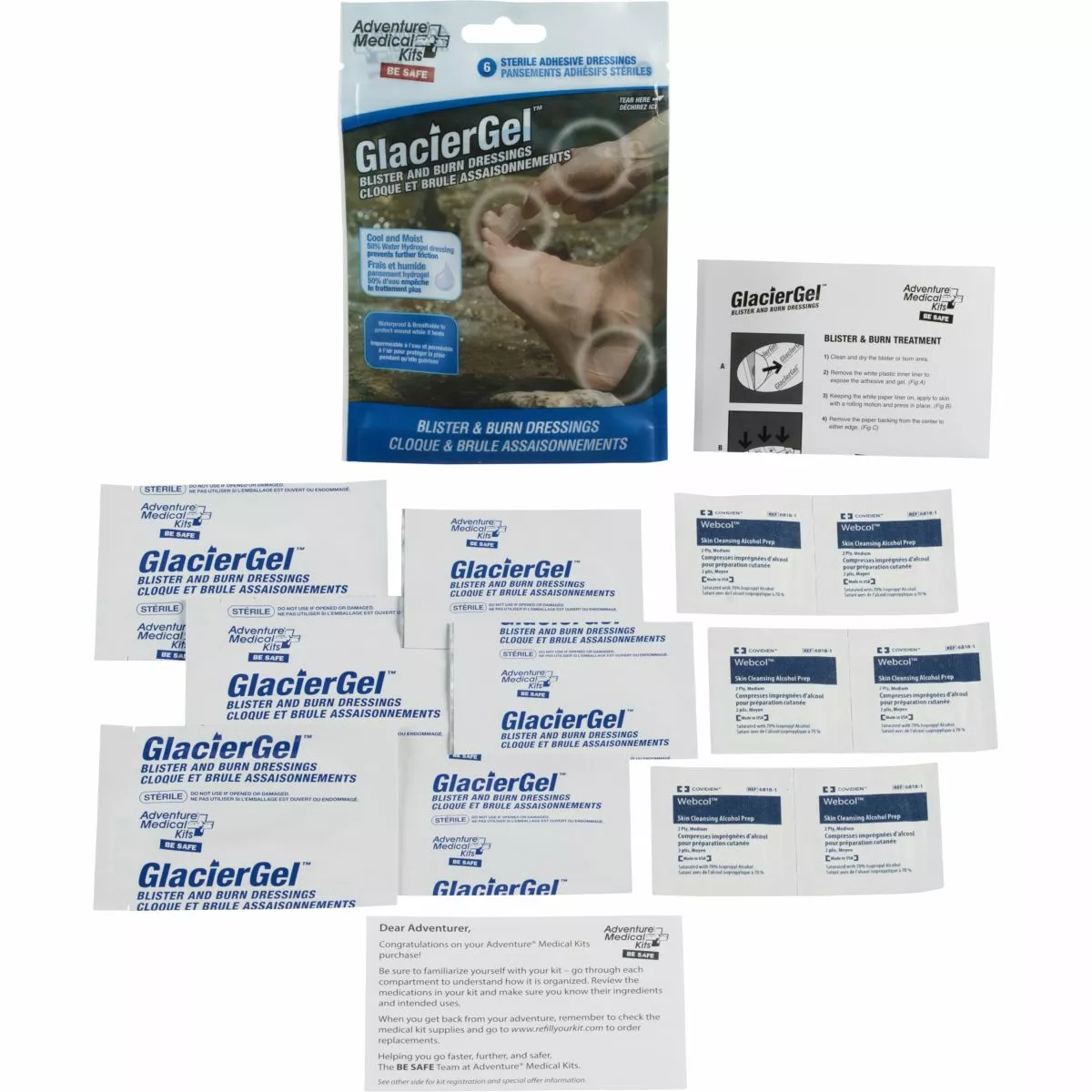 Adventure Medical Kits introduces the next generation in blister dressings: Glacier Gel! These waterproof, breatheable adhesive gels are easy to apply and stays in place for multiple days. They are highly cushioning, cooling and absorbent which provides instant and complete pain relief for blisters and burns.