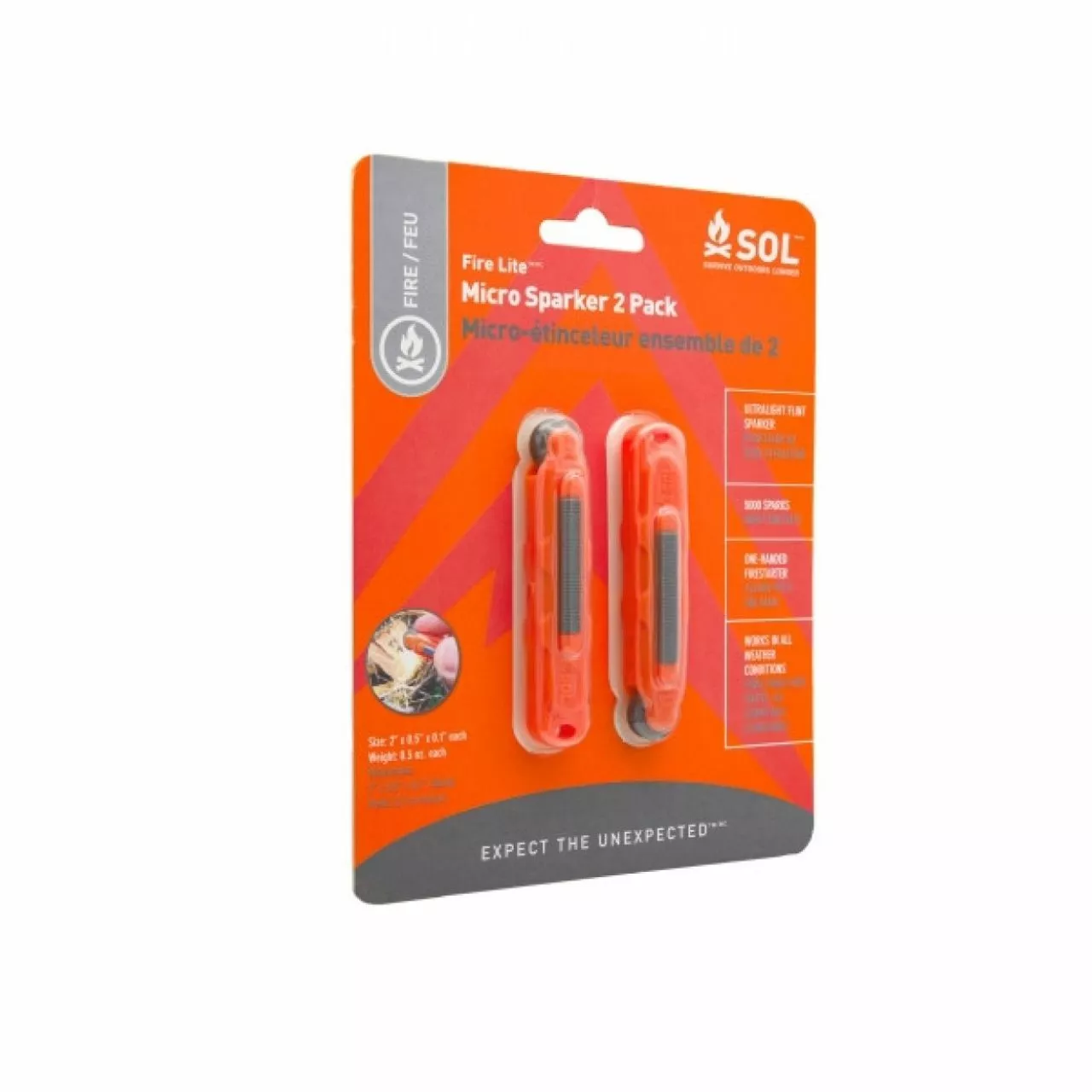 The SOL Fire Lite Micro Sparker enables you to start a fire even in the fiercest conditions. Produce sparks with one hand, even when it is windy. The rubberized grips along the sides provide a secure grasp when lighting in cold conditions. Lightweight and compact, it packs easily into emergency kits. Sold as a two-pack, keep one in your emergency kit and one at home so you will never be without a fire starter.
