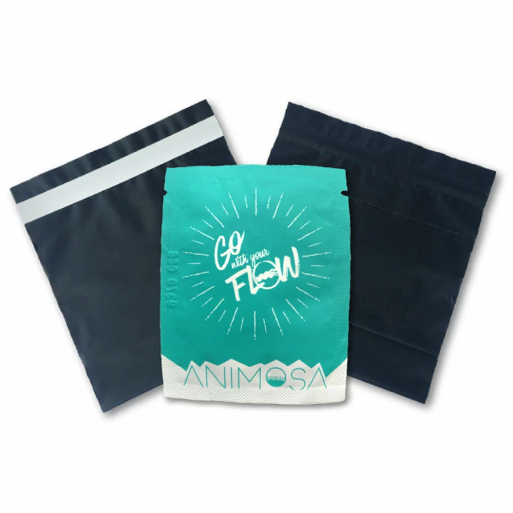 Sealable bags hold used period supplies and wipes. Certified compostable biofilm is derived from 100% non-GMO renewable plant materials (petroleum-free). Completely opaque to conceal contents. Peel-off adhesive strip creates permanent seal. Thick, silky-soft biofilm is completely opaque to hide contents. Made for Animosa by a woman-owned, woman-led company in Oregon (USA). Refills available (sold separately).