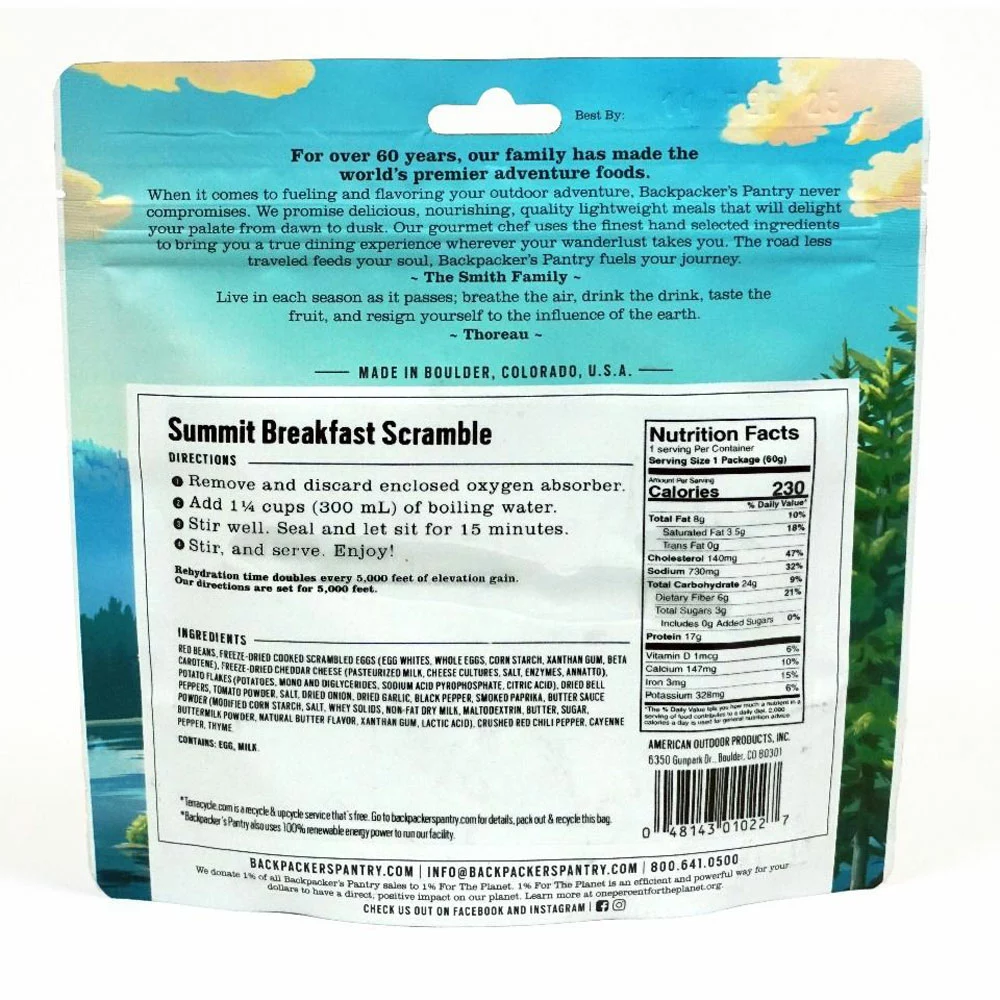 The Summit Breakfast Scramble is a hearty mix of red beans, scrambled eggs, cheddar cheese, and peppers. No skillet needed, just add boiling water so you can sit back and listen to the music of the mountains while breakfast is being made.