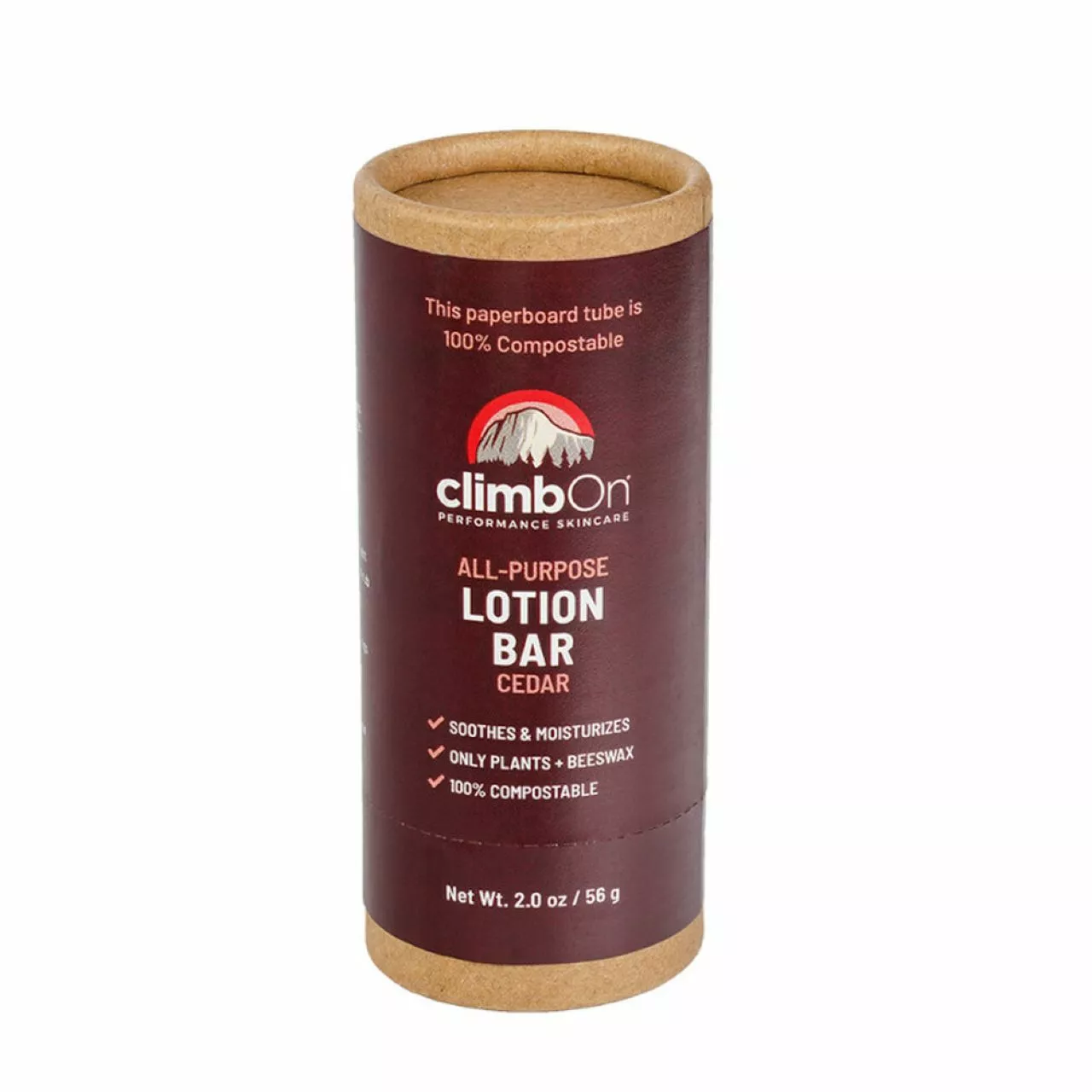 The classic ClimbOn Lotion Bar Cedar now comes in a compostable paper tube and is easy to rub on the skin for moisturization and skin nourishment, including dry hands, cracked skin, calluses, cuticles, and much more. The Cedar bar has a woodsy, alpine scent from cedarwood, lime, myrrh, and frankincense.