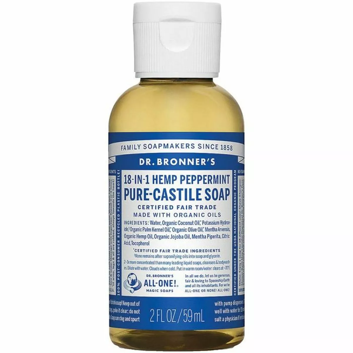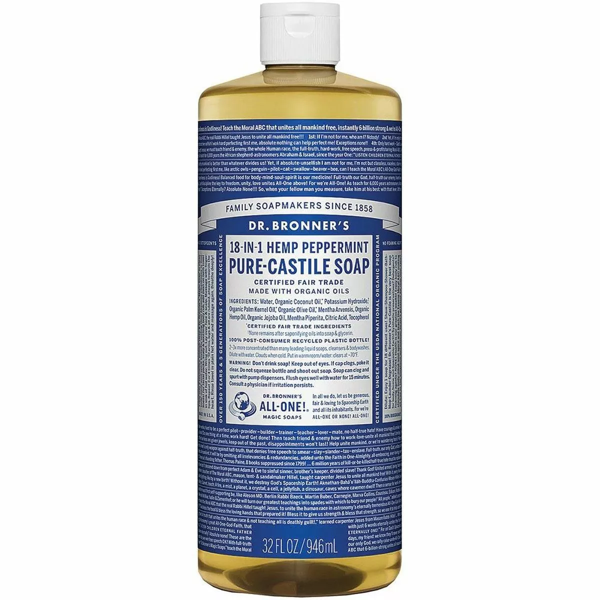 Dr. Bronner’s Peppermint soap is biodegradable, vegetable based and made with Certified Fair Trade and Organic Oils. The peppermint essential oils tingle the body and clear the mid. Because therapeutically peppermint oil is a mild stimulant, it can increase vitality and clarity.