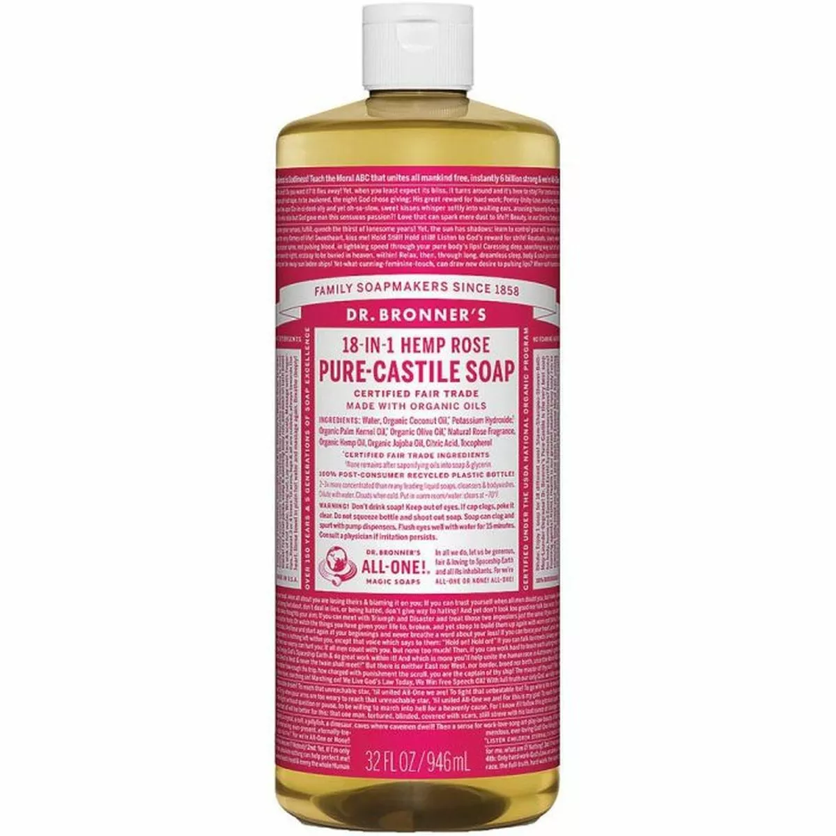 Dr. Bronner’s 18-in-1 Pure-Castile Soaps are good for just about any cleaning task. Face, body, hair & food, dishes, laundry, mopping, pets—clean your house and body with no synthetic preservatives, detergents or foaming agents—none! Like all of their other soaps, it is certified organic under the USDA National Organic Program. All soaps are also certified Fair Trade. Packaged in 100% post-consumer recycled (PCR) plastic bottles.