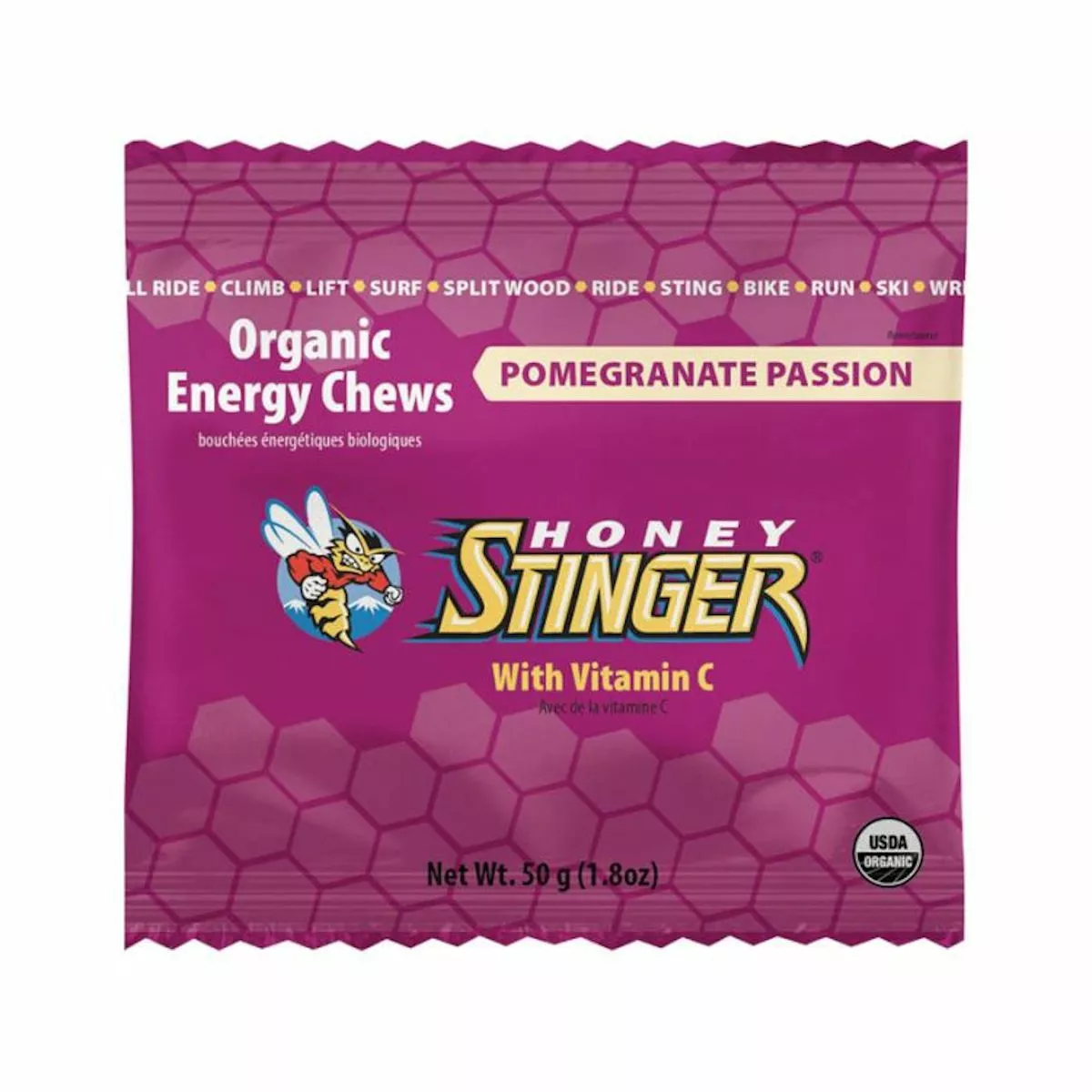 For just one bag of the Honey Stinger Organic Energy Chews it delivers 100% of the recommended daily allowance of vitamin C, 1 gram of protein, and 1 gram of fiber combined with honey, a source of naturally occurring enzymes, amino acids, and antioxidants. Dairy and gluten free.
