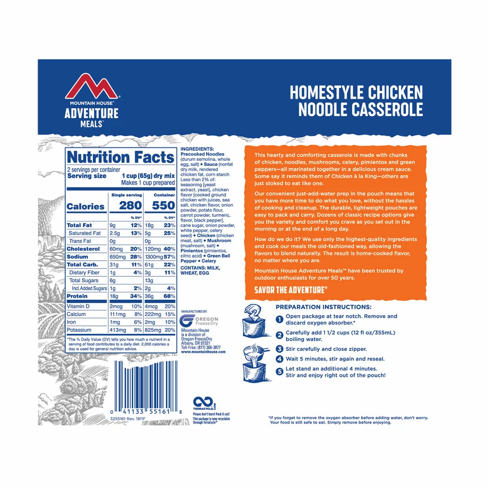 Comfort food at its best: Mountain House Homestyle Chicken Noodle Casserole is a classic dish that’s high in protein and has no artificial flavors, preservatives, or colors.
