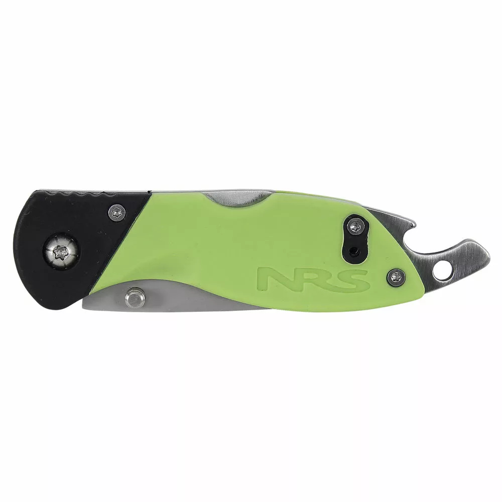 The Green Knife from NRS features a 2 1/8 inch blunt tip blade that folds away small. The handle is outfitted with a bottle opener and a lanyard hole.