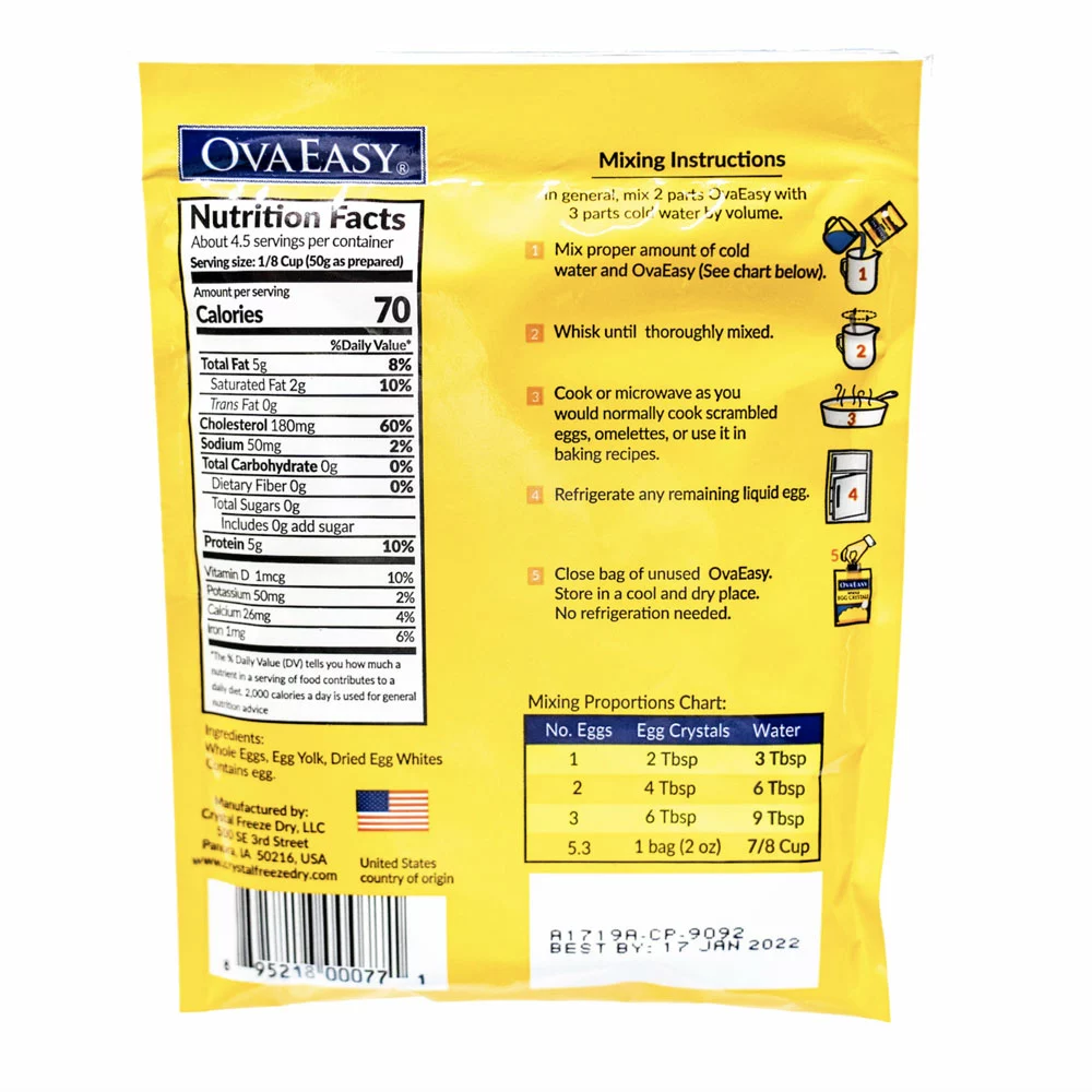 OvaEasy Crystal Egg is a delicious, all-natural dried egg that tastes just like fresh eggs! Simply mix with water and cook as you would normally cook eggs. OvaEasy is all-natural, pure whole egg and requires no refrigeration until prepared.