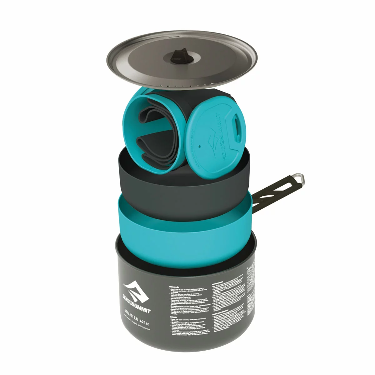 • When folded, the Pivot-Lock™ handle locks the lid to the pot to contain the complete set for compact packing