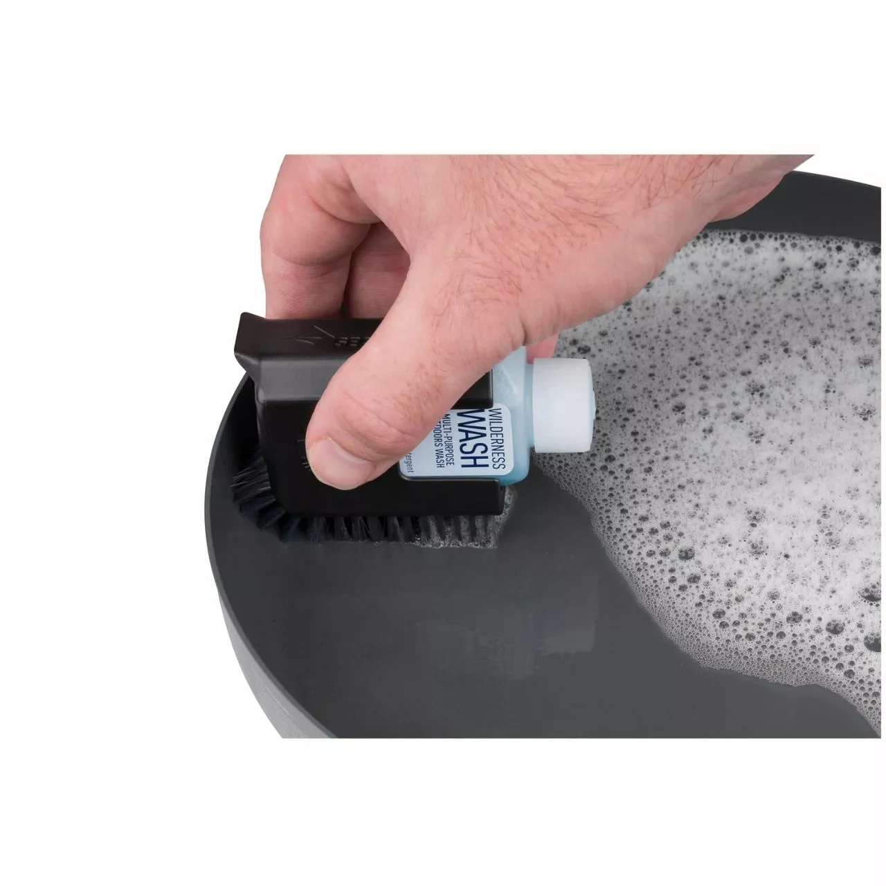 - Wilderness Wash bottle stows in pot scrubber, then flips around for easy dispensing