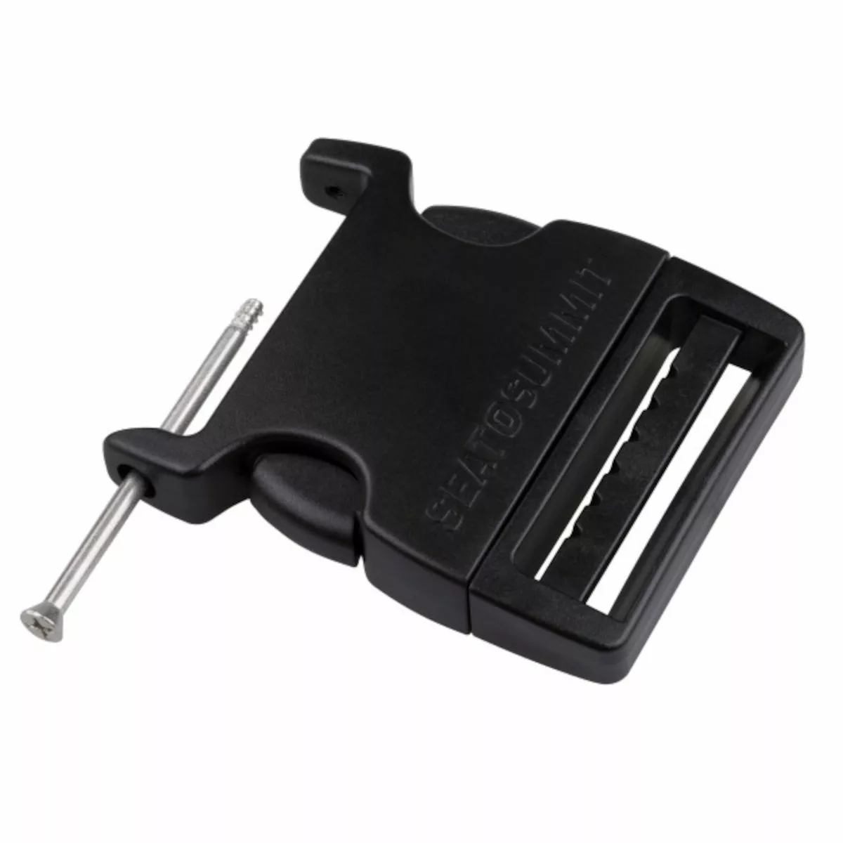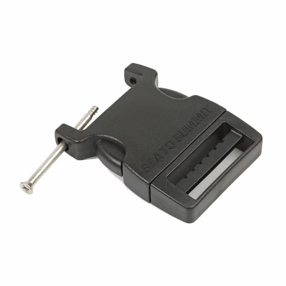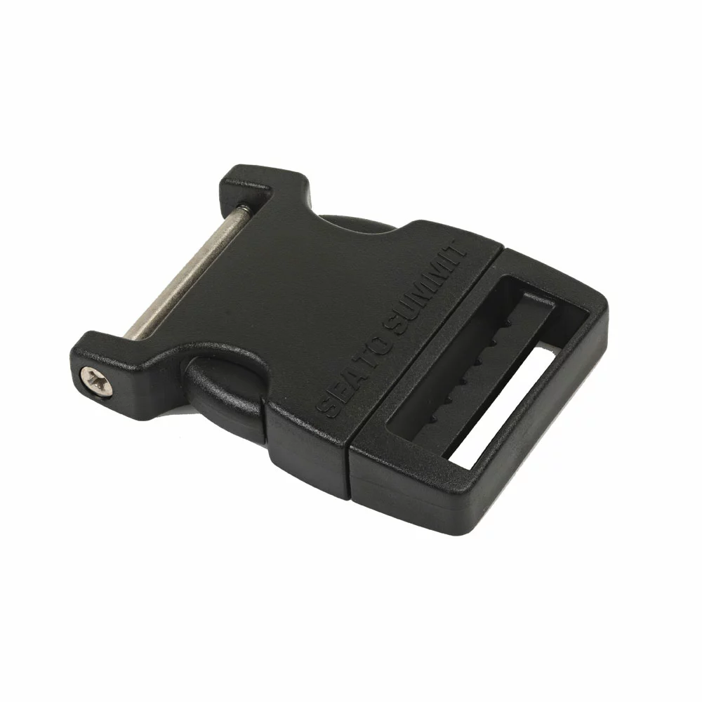 One-pin side release buckles replace closures found on most top-loading backpacks, daypacks, messenger bags, PFDs, bike bags etc. They have one fixed end and one ladderlock end – the ladderlock allows you to thread through a webbing strap which can then be tightened or loosened.
