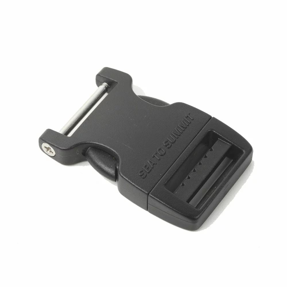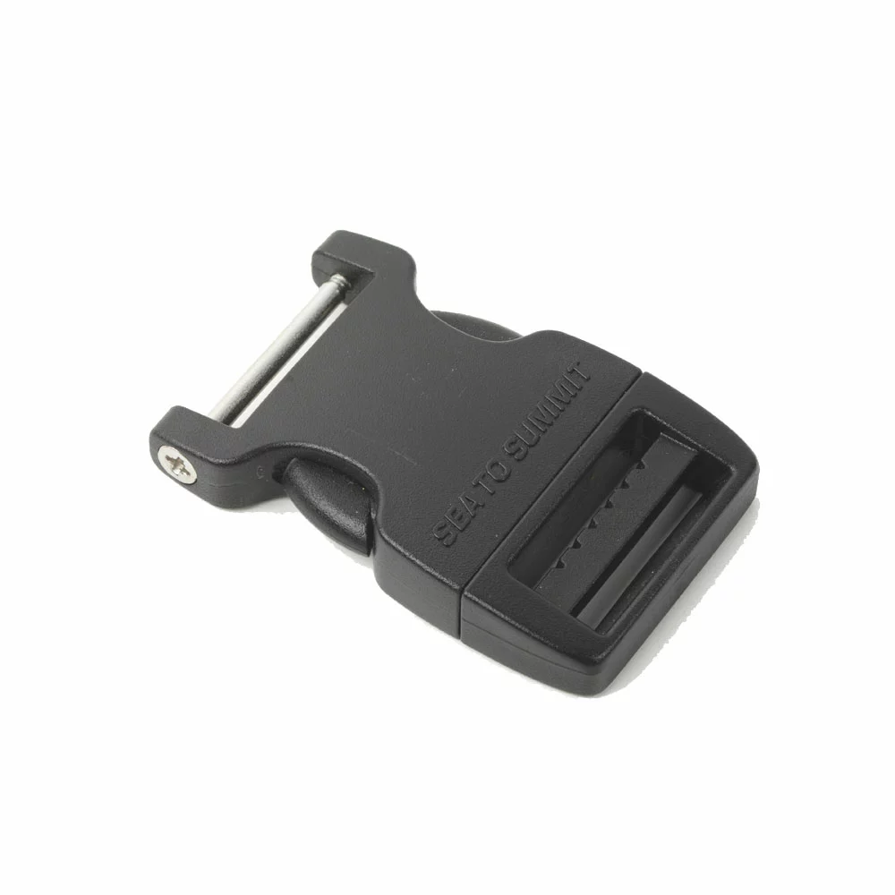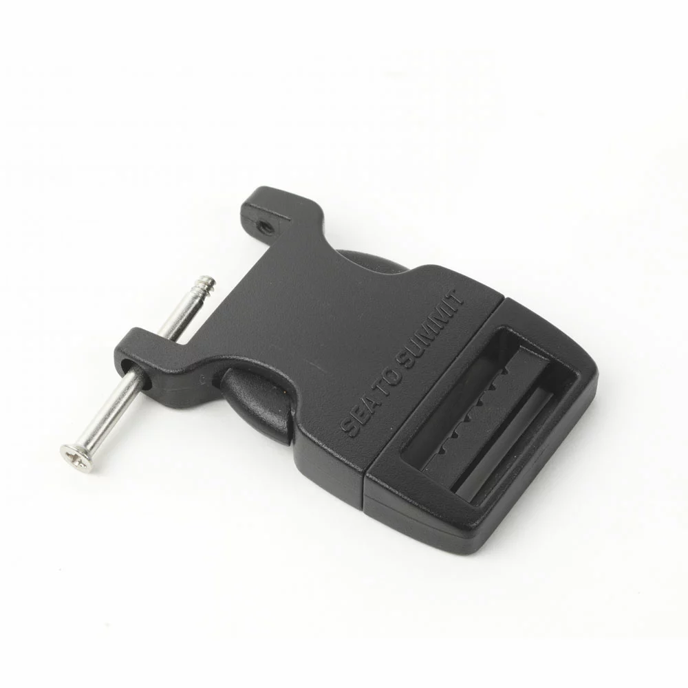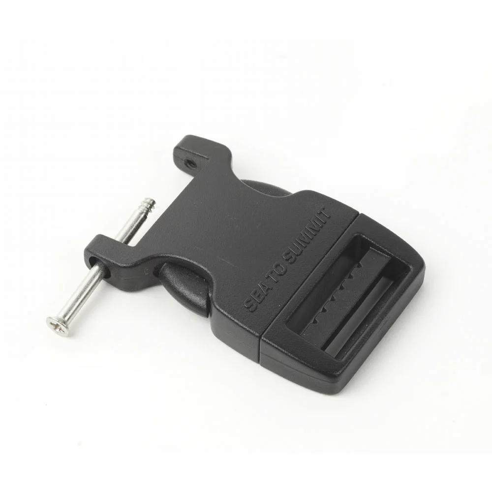 One-pin side release buckles replace closures found on most top-loading backpacks, daypacks, messenger bags, PFDs, bike bags etc. They have one fixed end and one ladderlock end – the ladderlock allows you to thread through a webbing strap which can then be tightened or loosened.