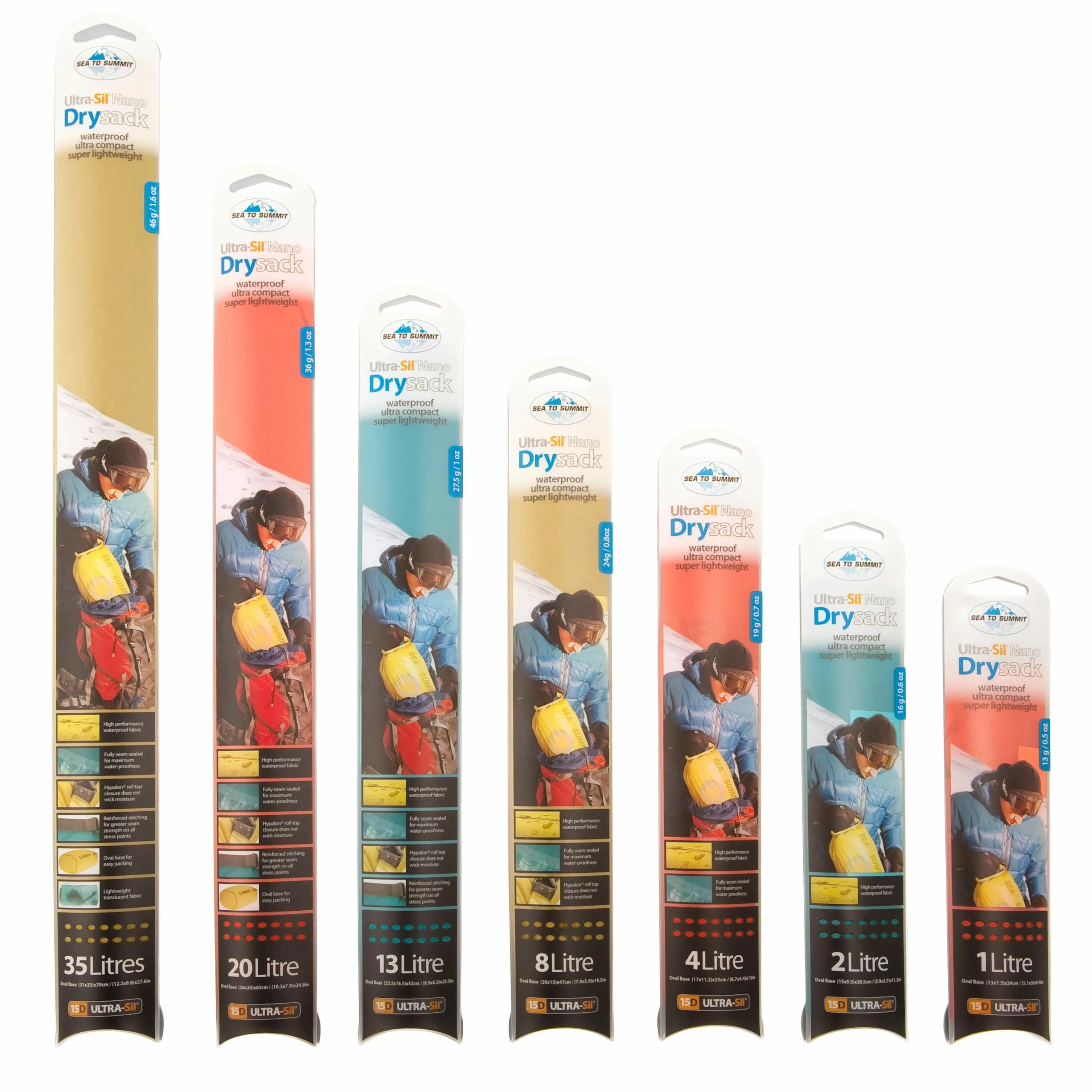 In the age of ultra-lightweight everything Sea to Summit has developed a range of ultra-lightweight dry sacks to save those crucial few grams. Using a 15 denier Sil/PU nylon fabric they call Ultra-Sil Nano, a lightweight side release buckle and a thinner roll top closure they have created a dry sack that is 30% lighter than their standard 30D Ultra-Sil Dry Sacks!