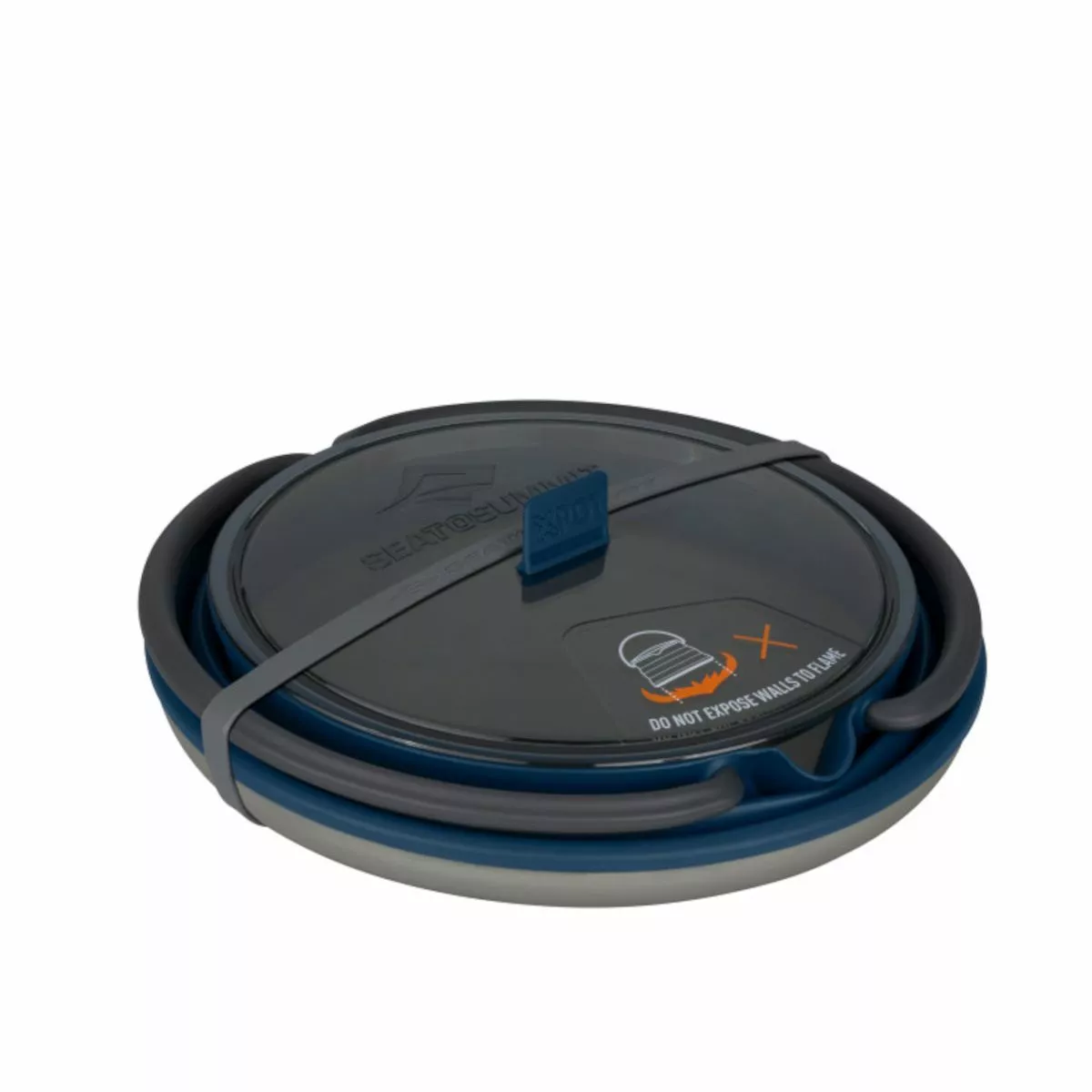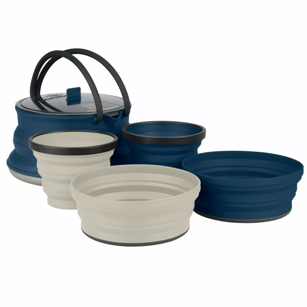 The X-Pot / Kettle 2L nests two collapsible X-Mugs (16.2 fl oz volume) and X-Bowls (22 fl oz), both of which are made from food grade flexible silicone.