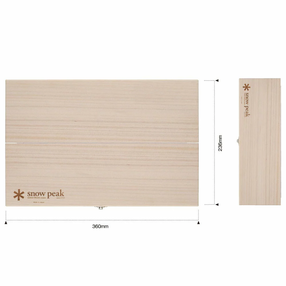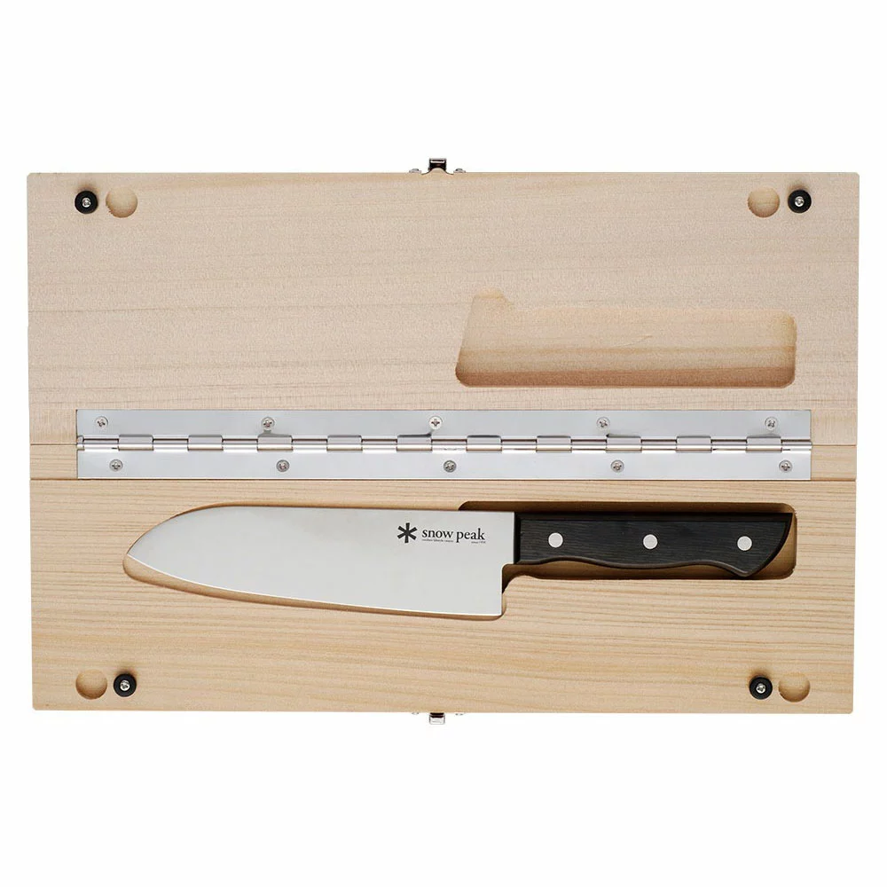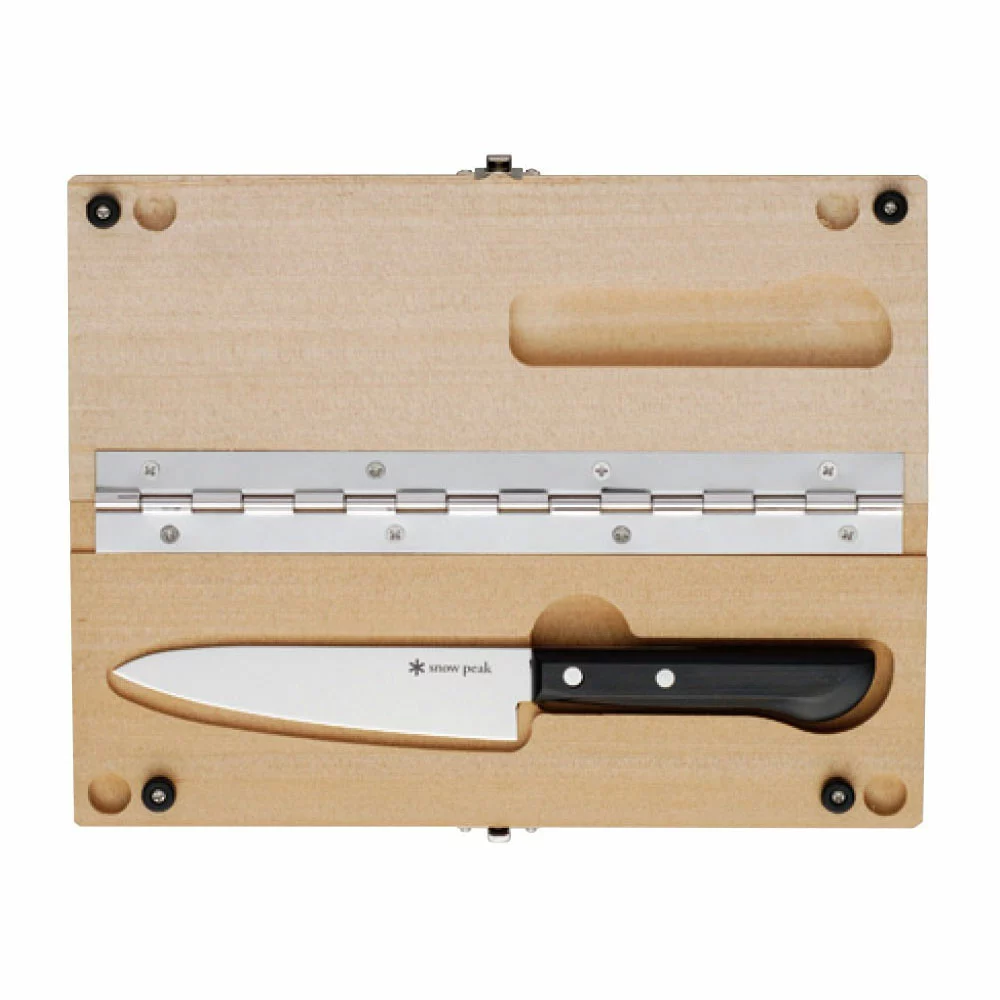 The Snow Peak Chopping Board Set features a natural wood cutting board and a multipurpose knife, perfect for the gourmet cook in the backcountry.