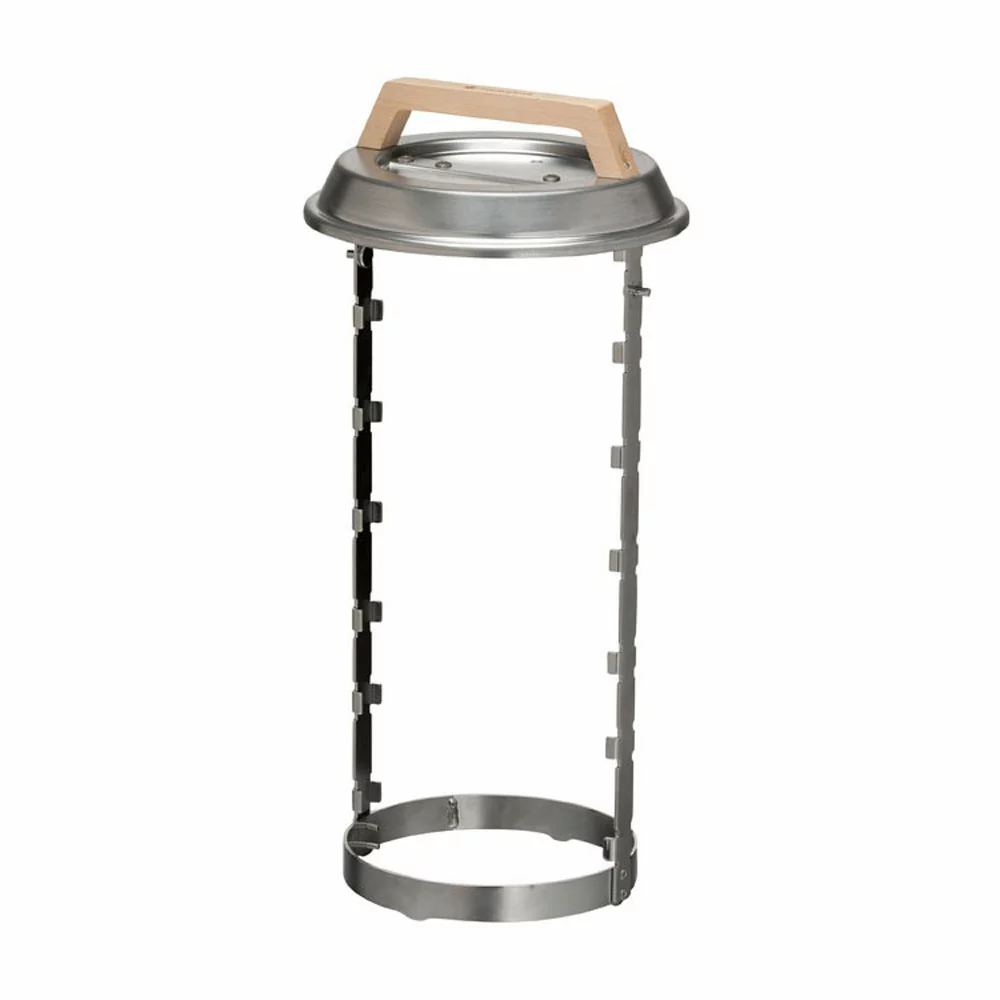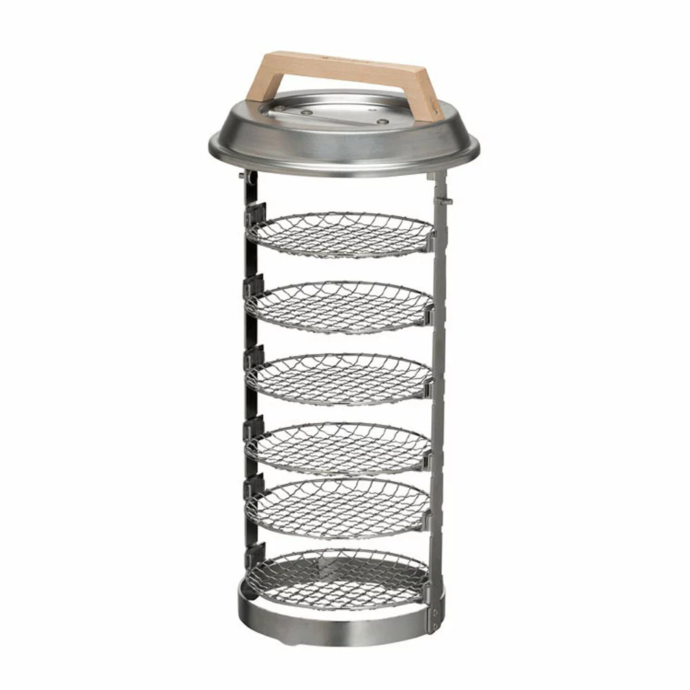 To use, add wood chips and a few hot coals to the bottom of the smoker, then stack meats, fish, or vegetables on the nets. The Smoke Meister features a stand frame, six nets, a juice pan, and a storage case, as well as an adjustable lid for controlled ventilation.