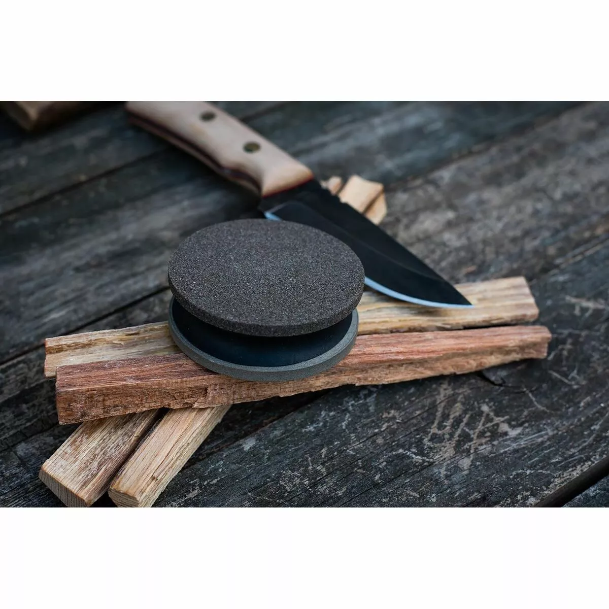 The 80 grit removes steel in a controlled manner for repairing chips and re-shaping blades from heavy use, while the 220 side refines the blade for additional sharpening, or keeping the edge maintained. It’s the perfect combination for repairing your blade by hand, without having to worry about damaging the steel’s temper on a bench grinder or other automatic sharpening device.