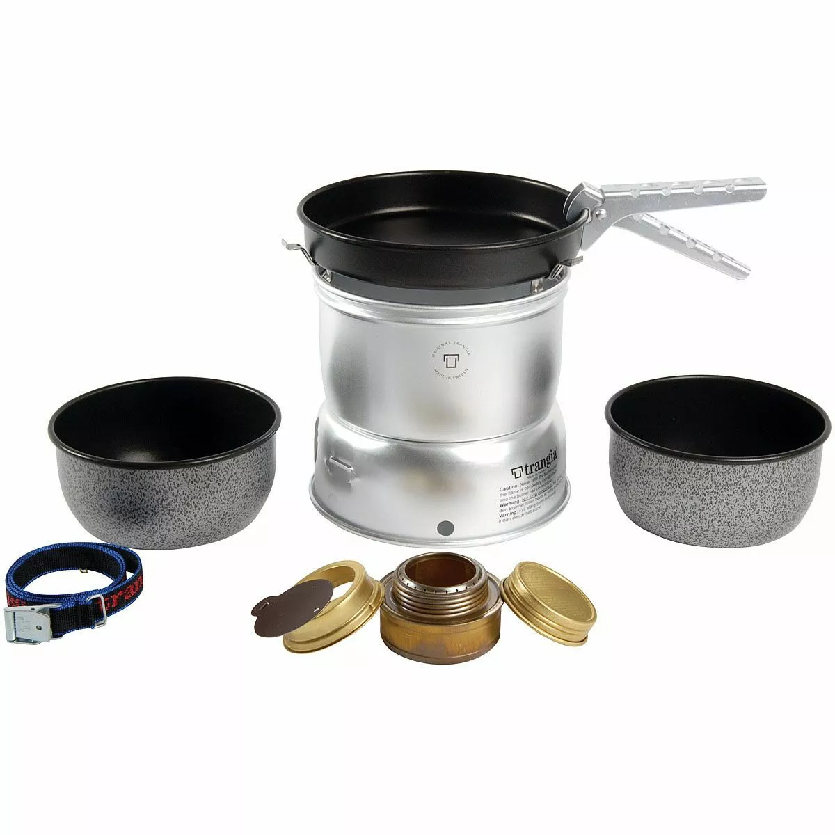 Featuring Trangia’s new ultralight aluminum alloy, this set comes with an ultralight aluminum stove, two 1.0 Liter non-stick aluminum saucepans and one 7″ aluminum non-stick frypan.