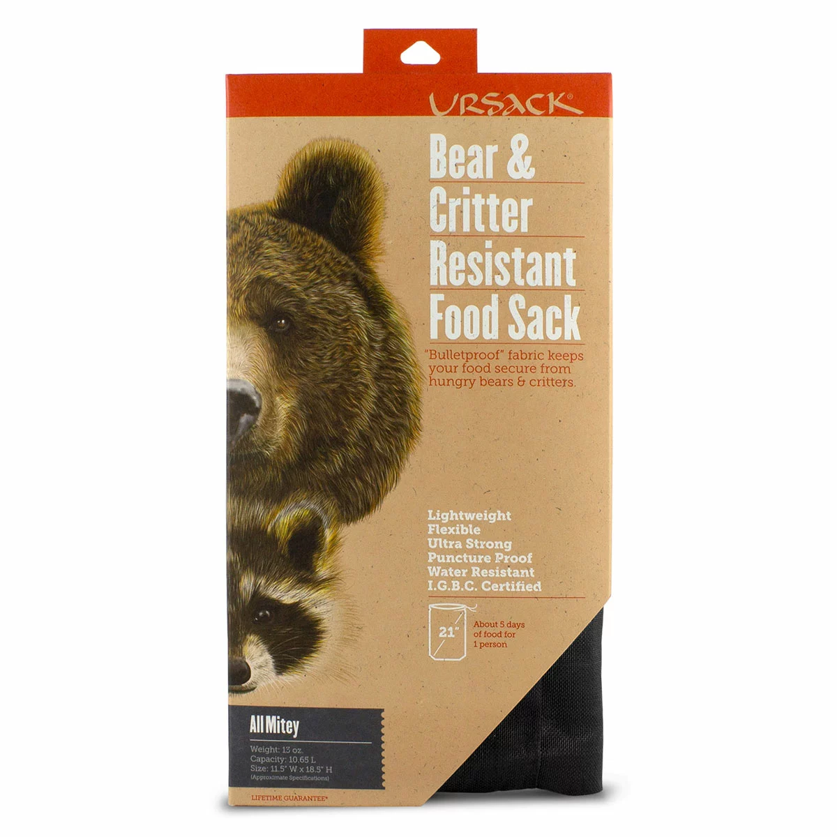 Limited Lifetime Warranty: Ursack will replace, or refund the cost of, any properly used AllMitey in which a gap, tear or hole larger than 1/4 inch is caused by any wild animal. This 1/4 inch standard is the criteria used in the Interagency Grizzly Bear Committee’s test protocol. Ursack asks that customers return any damaged Ursack to them for inspection (do not return it to the retailer for warranty). For more information, see the FAQ section at www.ursack.com.